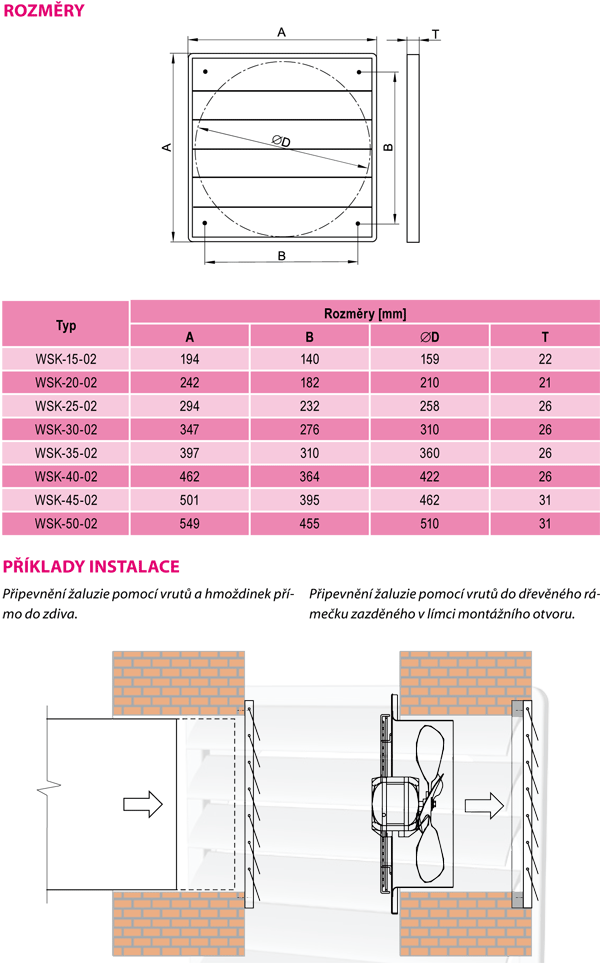 Přetlaková samočinná žaluzie WSK se používá jeko protikus k nástěnnému ventilátoru nebo jako zakončení kruhového vzduchotechnického kanálu. Při odstavení ventilátoru z provozu se tak zamezí zpětnému proudění vzduchu proti ventilátoru, samovolnému proudění vzduchu kanálem, vniknutí deště, prachu a hmyzu.